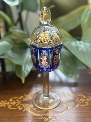 Bohemia krystalbæger med låg på lavet i overfangsglas , håndslebet blykrystal , emalje og guld , fra rokoko tide, fremstilling 1950-1970