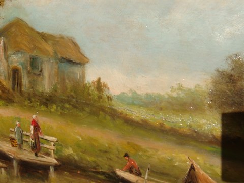 Painting the house down to the jetty. where the boat comes in with the father and mother and daughter are waiting on the bridge. Signed: