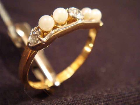 Svensk ring af guld, 20 karat., front prydet med brillant, 0,15 ct., Wesselton VS, flankeret af fire SOUTH SEA perler.