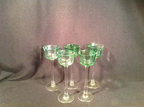 3 Grønne likør glas på høj stilk med optisk stribet kumme.